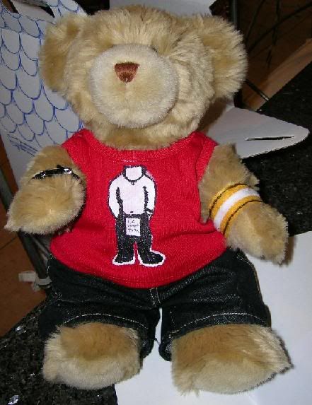 For my friends birthday a few months ago I made her a Dom!bear, and I decided to make a Billy!bear for myself. So here he is, in all of his adorably furryness. I had to buy the tux but sew on the black shirt and tie, and I had to make the kilt. The socks are baby socks, and the shoes were from the store where I bought the bear. :)